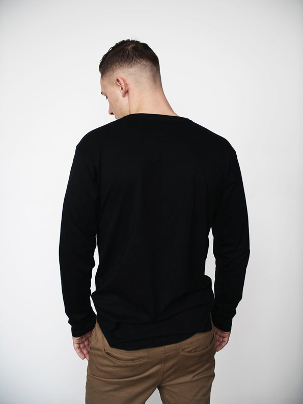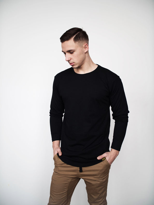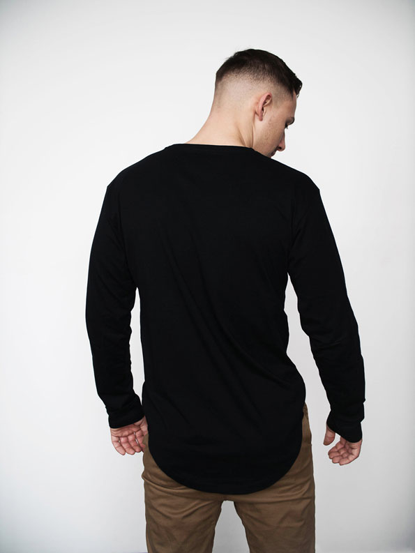 Extended length long sleeve shirt features underarm patch designed to create an unrestricted feeling under the arms.