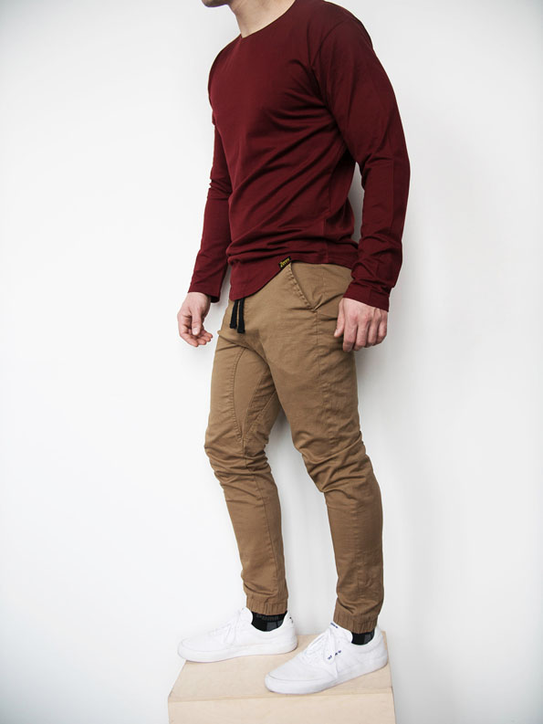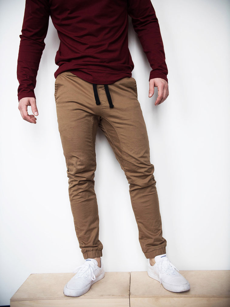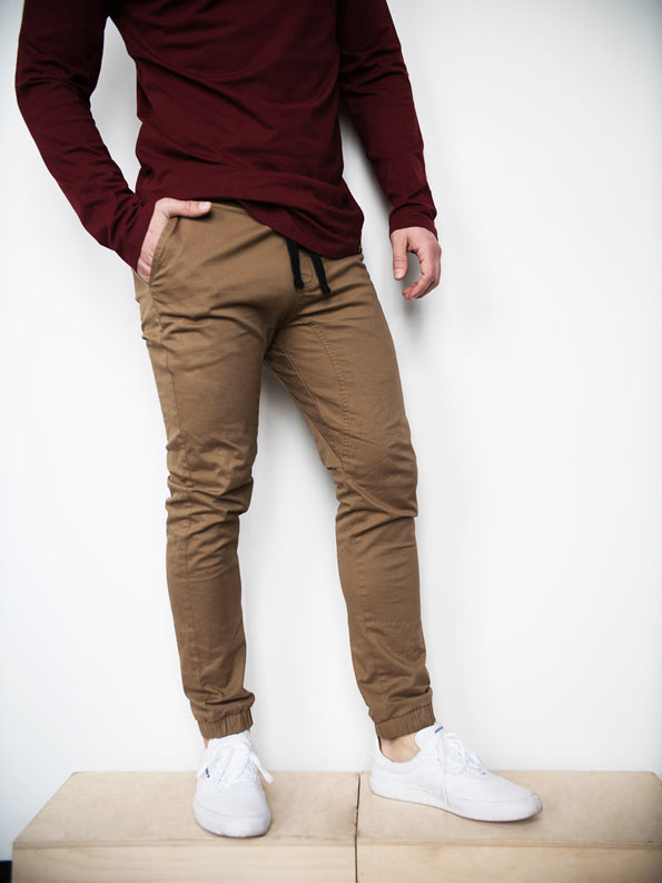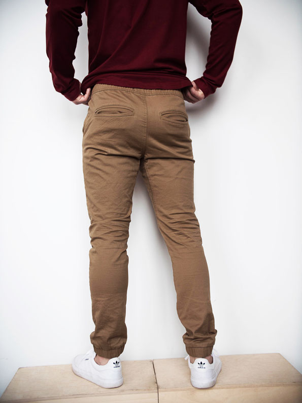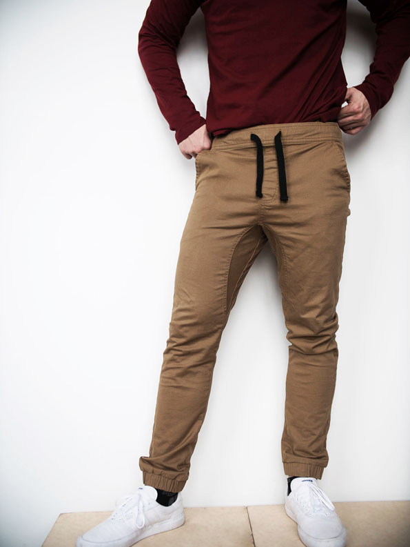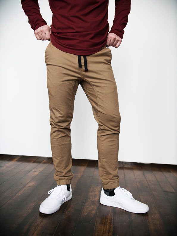Fabric is composed of Cotton and Spandex, Cotton provides the natural, durable, color holding properties while Spandex adds stretch and stability. Our tan joggers are made to feel like soft khakis with stretch.