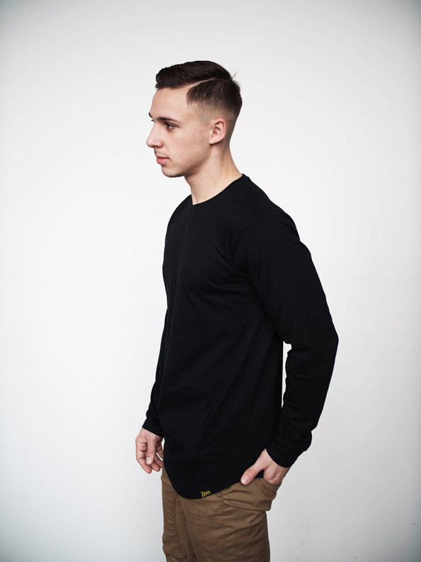Extended length long sleeve shirt features underarm patch designed to create an unrestricted feeling under the arms.
